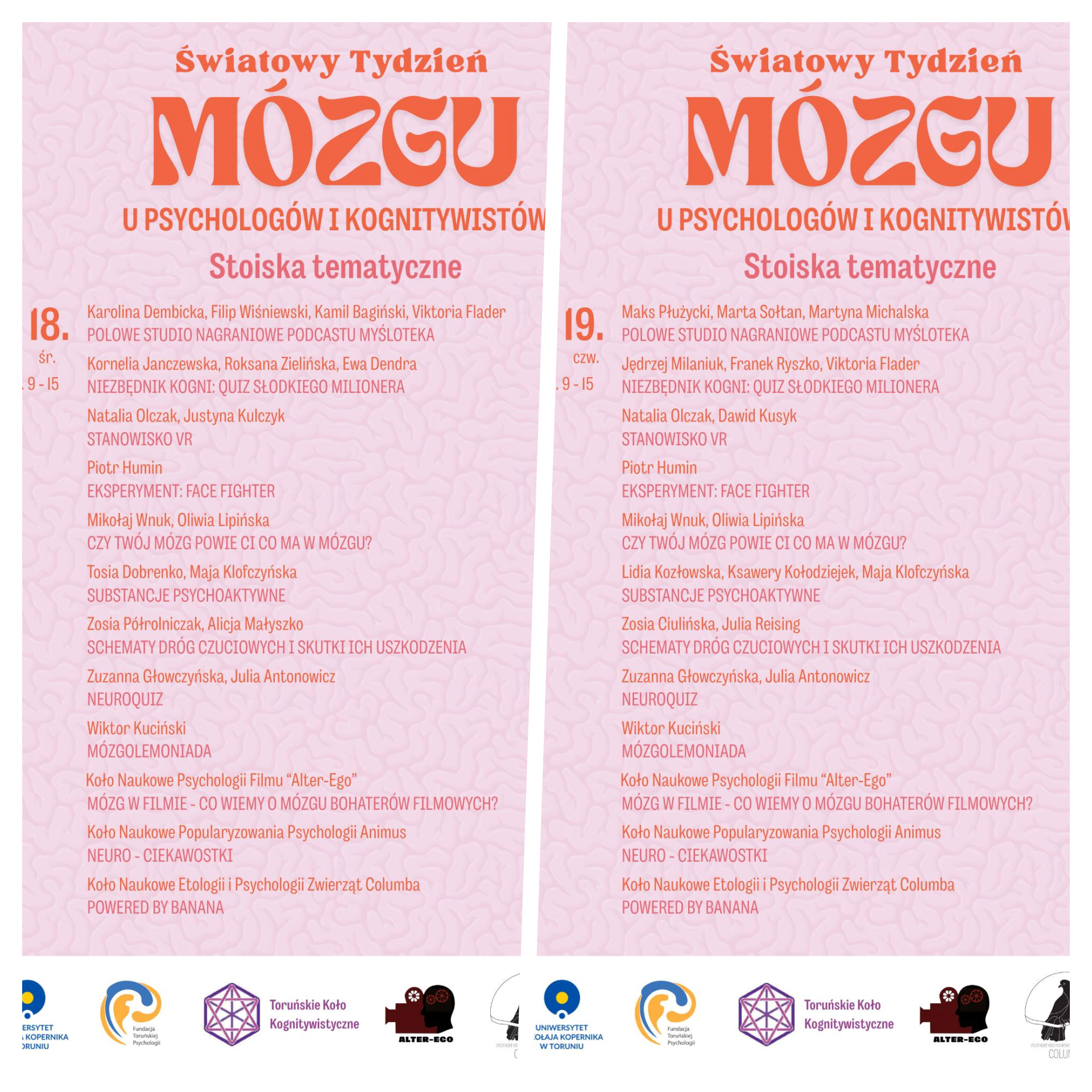 W dniach 13-19.03.2023 czeka nas wiele wydarzeń popularyzujących neuronauki – wykłady ekspertów z UMK w Toruniu oraz z takich ośrodków jak: Uniwersytet Gdański, Instytut Farmakologii im. J. Maja PAN w Krakowie, Instytut Psychologii PAN w Warszawie, Instytut Biologii Doświadczalnej PAN w Warszawie, Uniwersytet Kazimierza Wielkiego w Bydgoszczy oraz Towarzystwo Edukacyjne Vizja w Warszawie. Studenci i doktoranci psychologii i kognitywistyki UMK przygotowali bardzo bogatą ofertę warsztatów (dla dzieci, dorosłych, seniorów) oraz pokazów interaktywnych, jak również grę terenową związaną z mózgiem!